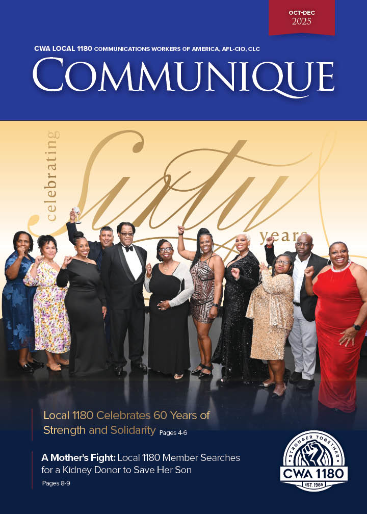 CWA Local 1180’s quarterly magazine, the Communique, has consistently garnered top awards in the Metro New York Labor Communications Council and the International Labor Communications Association contests. Competing against some of the country's best labor publications, the Communique repeatedly stands out in categories for both writing and graphic design, while Local 1180's outreach campaigns and social media programs take the highest of honors.