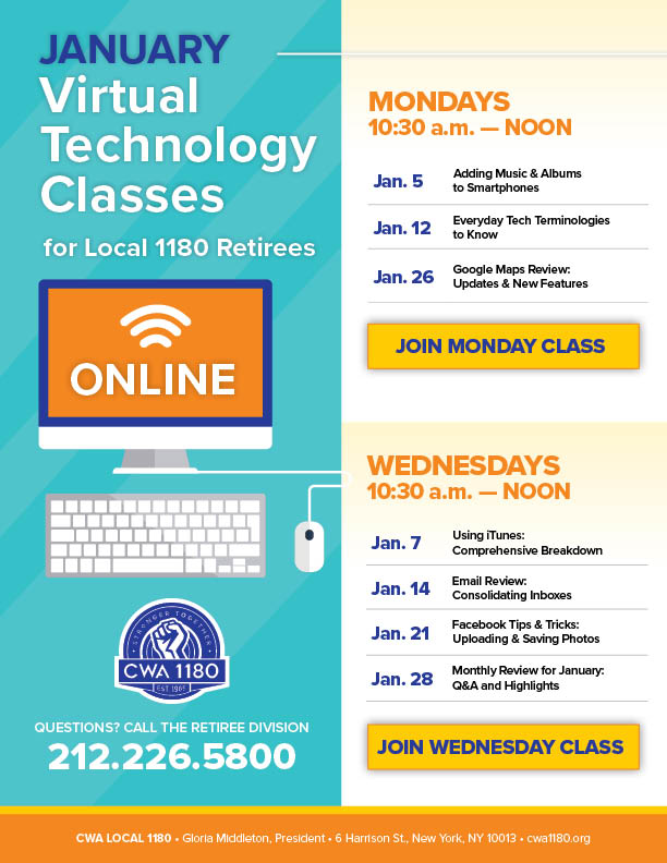 | Tues. 1/20 | IN-PERSON Review of Online Lessons / Q&A | 6 Harrison St. Call the Retiree Division to reserve your spot today: 212.226.5800 |